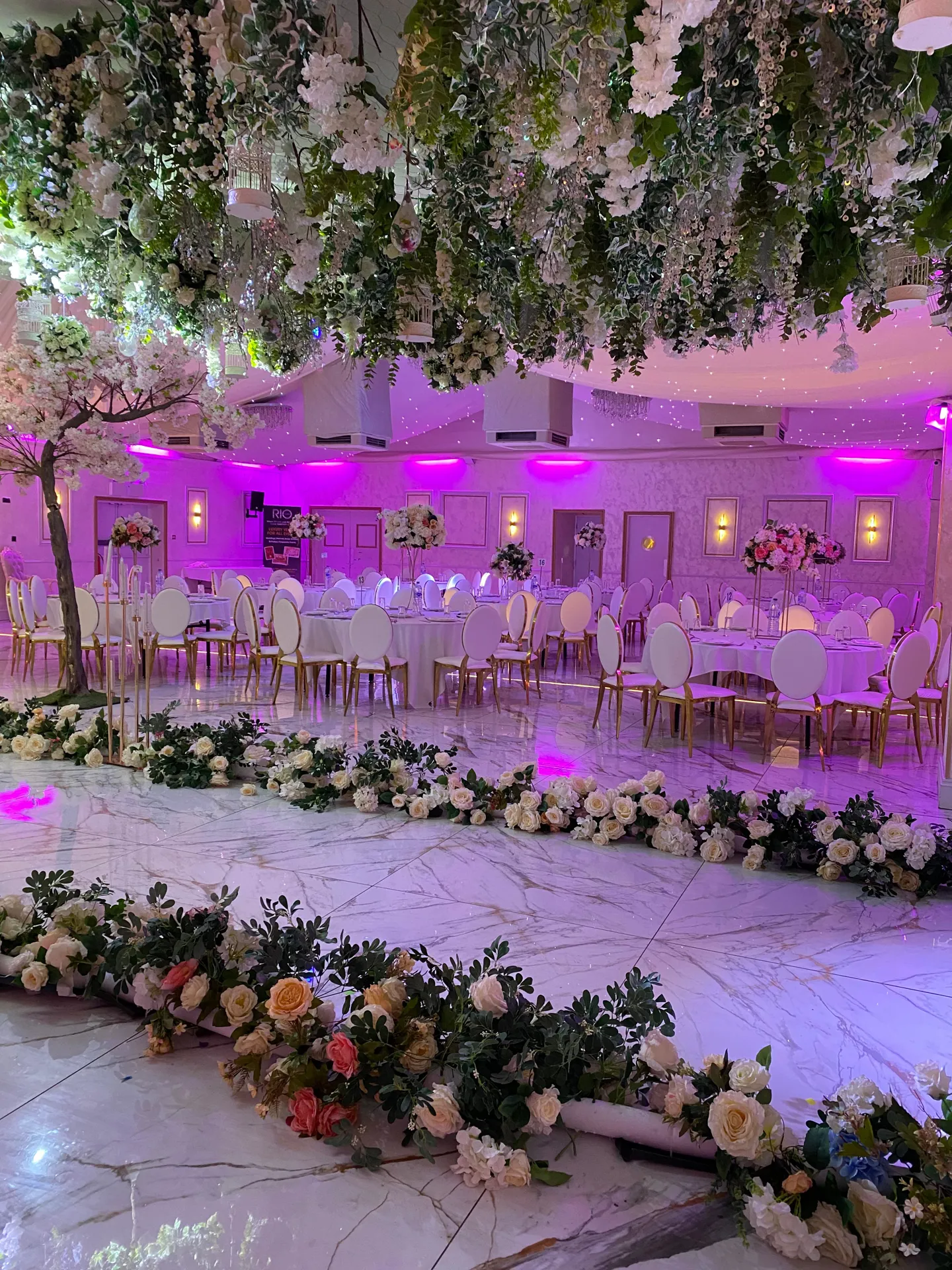 Simple but elegant stage range complimented by marble glass vases and blossom trees. Mood lighting, luxury bridal suite access and welcome drinks for guests upon arrival.