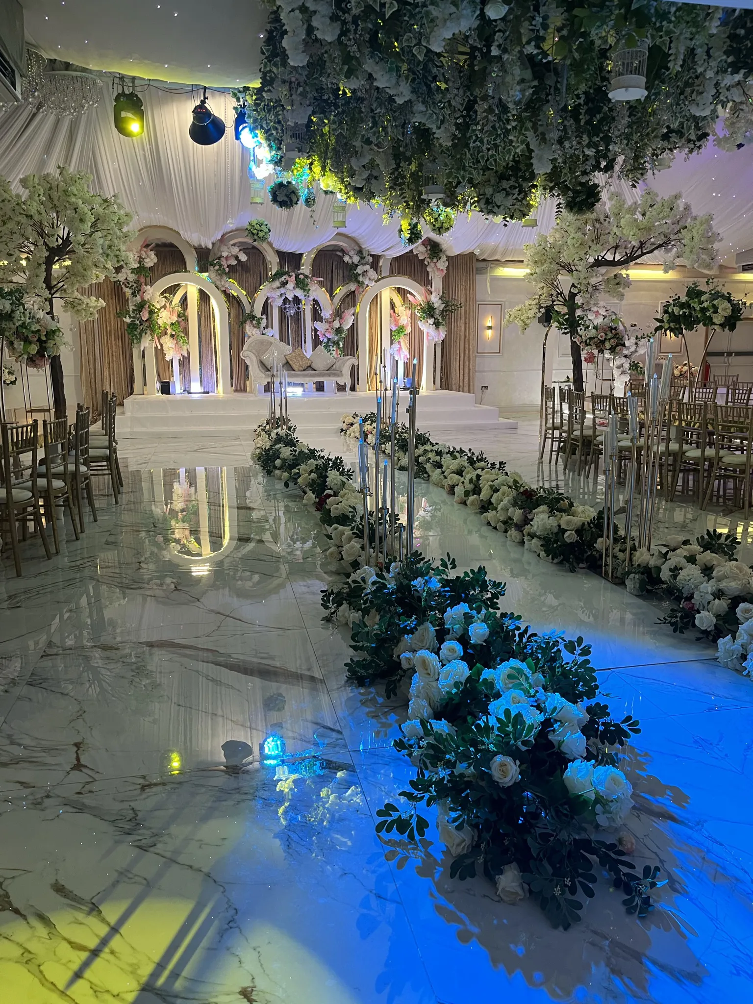 Simple but elegant stage range complimented by marble glass vases and blossom trees. Mood lighting, luxury bridal suite access and welcome drinks for guests upon arrival.