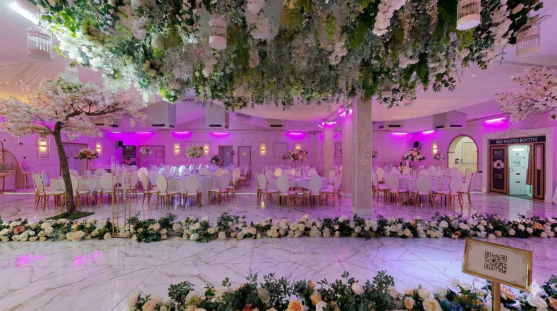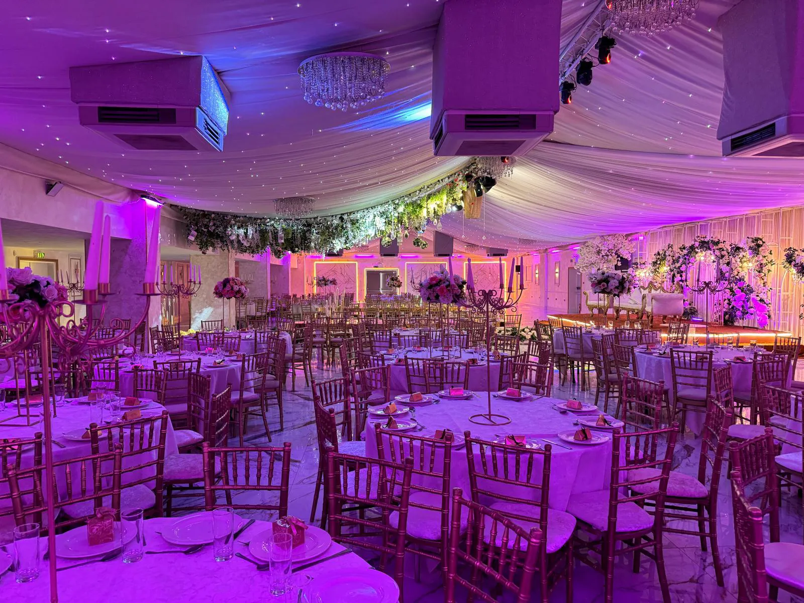 A bespoke stage design set to really impress - complemented by matching centrepieces, blossom trees, flower shower for the couple's entrance, chocolate fountain and a DJ to keep your guests dancing all night.